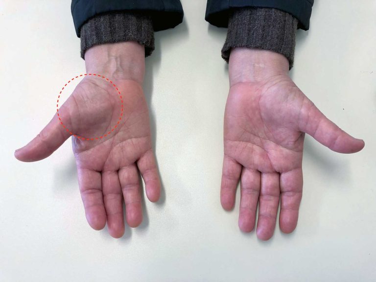 Síndrome do túnel cárpico grave, já com atrofia da musculatura da base do polegar