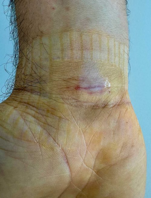 Aberta (através de uma incisão de cerca de 1cm na palma da mão), com anestesia local e sem garrote.